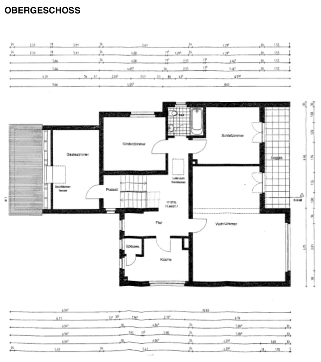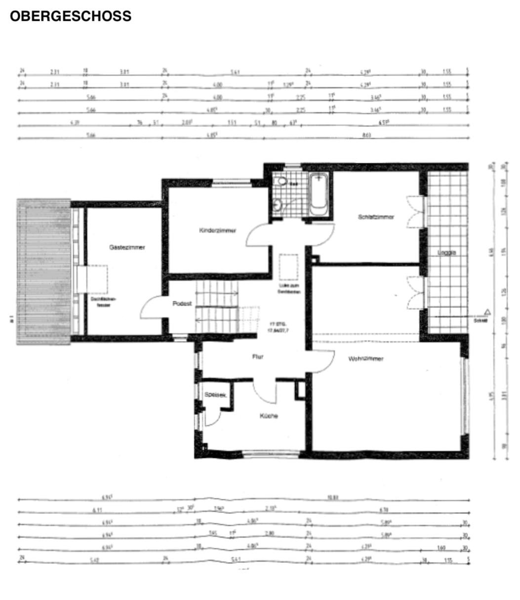 Eine bequeme Treppe im schwarzen Kunststein führt sie in das Gästezimmer. Es handelt sich hier um ein Zwischengeschoss (überbaute Doppelgarage). Das Obergeschoss teilt sich ähnlich aus wie das Erdgeschoss. Anhand der Grundrisse erkennen Sie, dass diese Ebene früher als offene, zweite Wohnung genutzt wurde. Es wurde als Mehrgenerationenhaus geplant und gebaut. Vier teilweise sehr große Zimmer befinden sich hier zur vielfältigen Nutzung. Ein Badezimmer und die Loggia vollenden das Obergeschoss. Über eine Einschubtreppe können Sie das nicht ausgebaute Dachgeschoss erreichen.